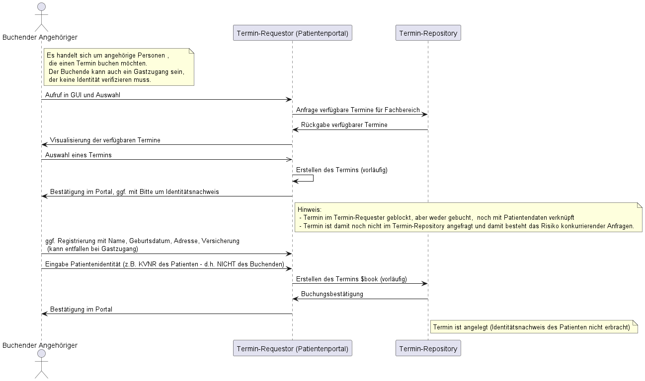 Folgendes Sequenzdiagramm detailliert den Ablauf unter Berücksichtigung der Akteure Termin-Requestor (z.B. Patientenportal) und Termin-Repository (z.B. KIS); offen bleibt hier allerdings noch der Ablauf zum Austausch von Patientendaten zwischen den Systemen: